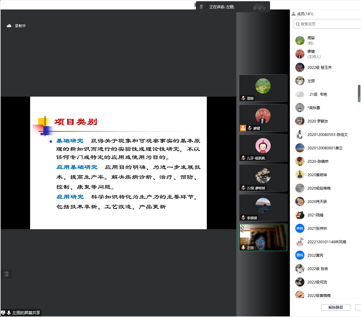 讲座中,左丽主要从科研的基本程序,包括如何进行科研选题及设计,进行观察和实验(实施),资料整理和数据分析,到科研课题申报的相关要求、申报书的撰写技巧等进行讲解,强调学会思考、阅读以及发现新问题。同时,按照研究生开题报告书的研究现状及发展趋势、研究目的和意义、研究内容、研究方法及技术路线、可行性分析及拟解决的关键问题、特色与创新之处、研究进度、预期结果、支撑条件等详解如何填写及阐明注意事项等内容。