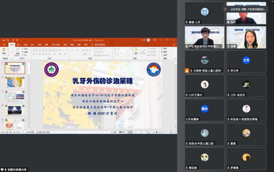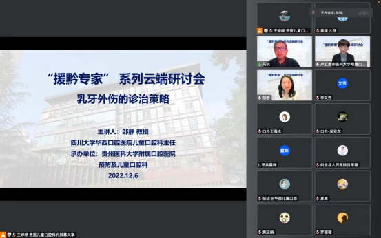 教工第十一党支部所在科室儿童口腔科,以视频会议形式组织开展了援黔专家云端交流研讨会。会议特邀请四川大学华西口腔医院儿童口腔科主任、《儿童口腔医学》副主编邹静教授以“乳牙外伤的诊治策略”为题作专题讲座。院党委副书记、院长马洪出席会议并致辞,儿童口腔科主任卢虹主持会议,近200余位教职医护员工、研究生、规培生参会学习。
