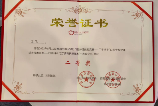 在“口腔专科护理适宜技术大赛——口腔科水门汀调和护理技术”中,石飞凭借娴熟的操作技能在众多参赛选手中脱颖而出,荣获二等奖,充分展现了91直播