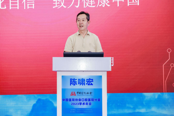 图:中国医院协会口腔医院分会主任委员郭传瑸在开幕式上致辞