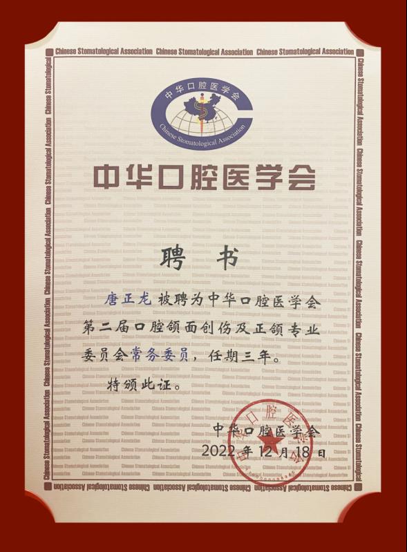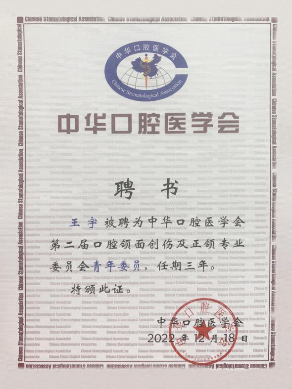 会上,唐正龙被聘为中华口腔医学会第二届口腔颌面创伤及正颌专业委员会常务委员,王宇被聘为青年委员。