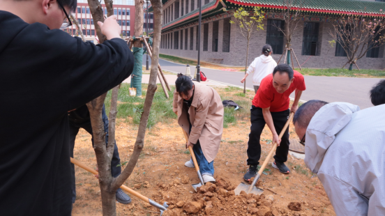 植树现场,老党员和青年学子们热情高涨,干劲十足,到处都是热火朝天的景象。大家相互配合,挥锹铲土、扶苗填坑、培土浇水,种下了一棵棵希望的树苗。