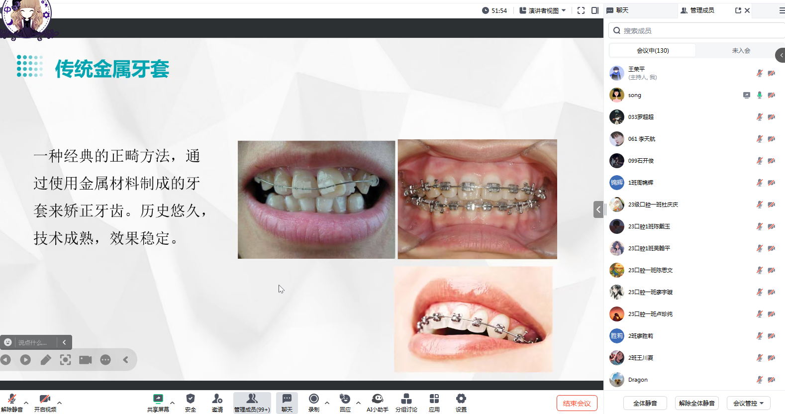 讲座中,宋明慧结合临床案例,运用专业的医学知识,从功能、美学、健康等多维度阐述了口腔正畸的必要性;从面诊、拍片制模、治疗等方面介绍了口腔正畸的操作流程;还从材料更新、工具使用等方面全方位分享了正畸技术与要点。同时,针对同学提出的问题予以专业细致的解答。