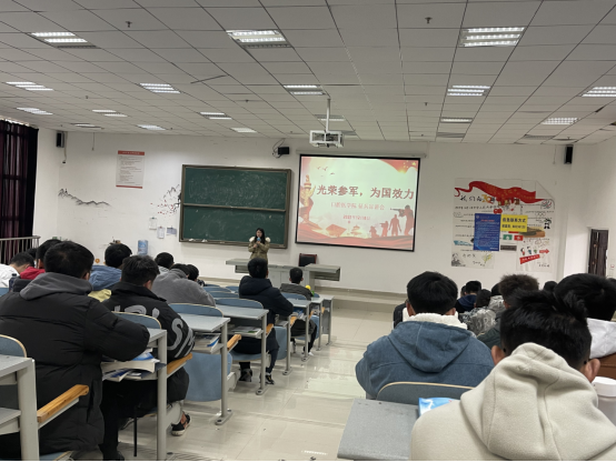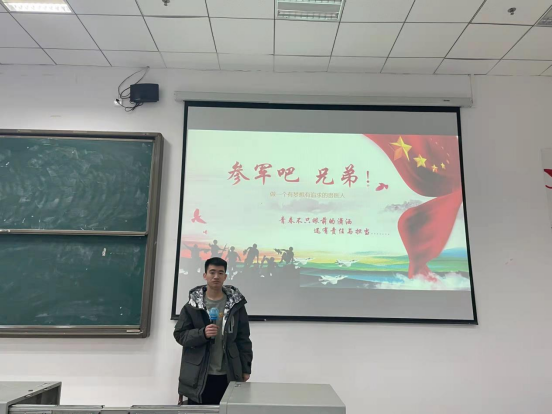 会上,孙迪结合自己毕业后入伍的从军经历,介绍了最真实而又值得怀念的军营生活,讲述了参军的意义、相关入伍优惠政策以及入伍相关流程,期间针对同学们的疑问耐心细致作答。随后,让同学们共同观看了征兵宣传片,进一步调动同学们参军报国的积极性、强化同学们服兵役的责任感与使命感。