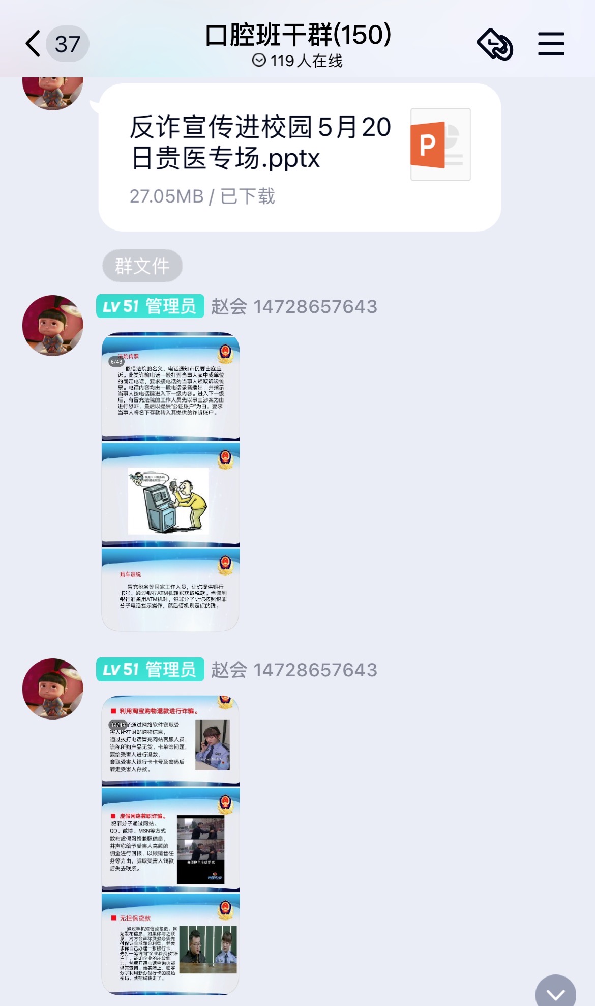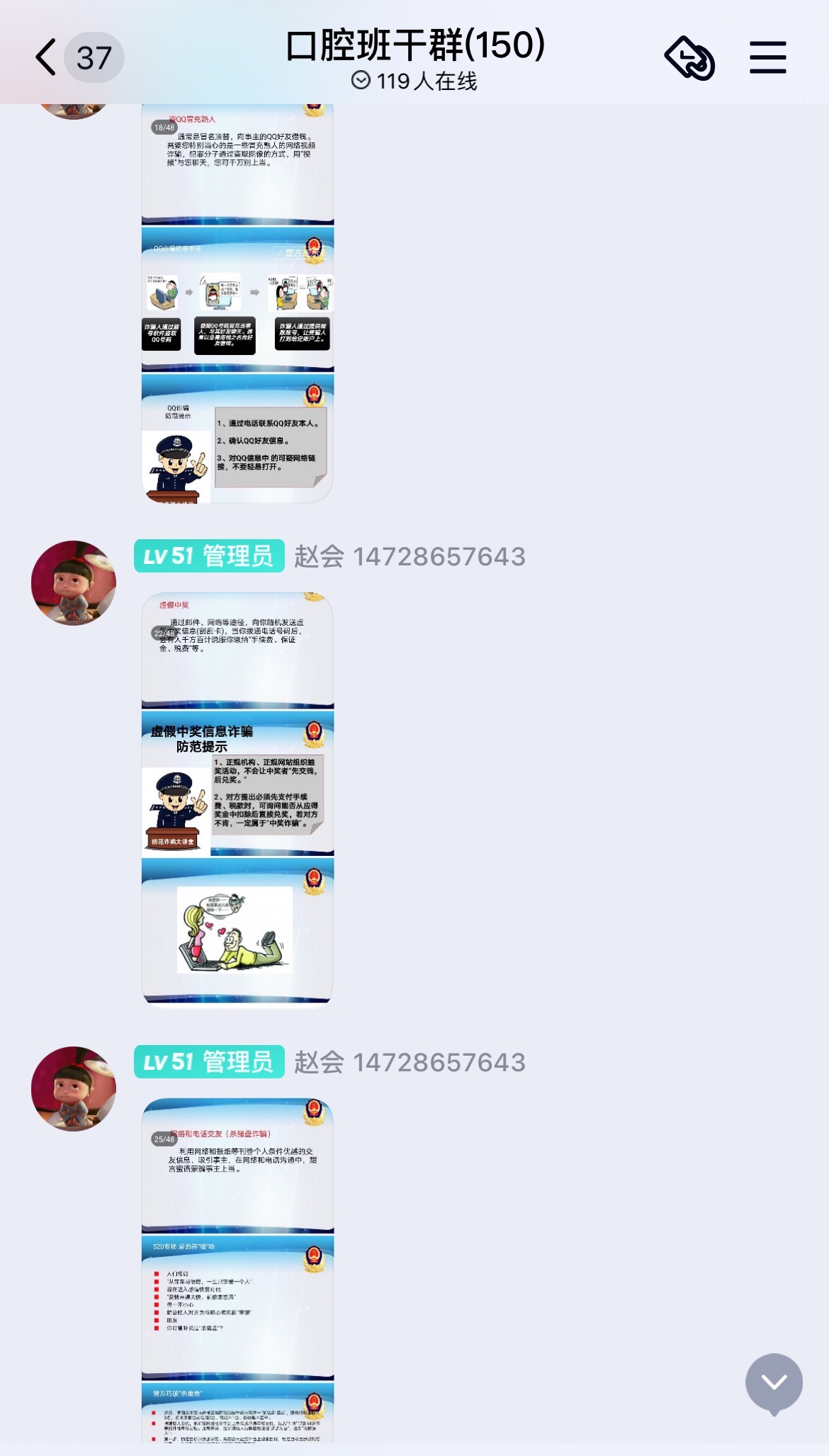会后,参与学习的辅导员和班干部在各班召开“安全防诈”主题班会,或将相应的反诈骗宣传材料通过班级QQ群对同学们进行宣传教育。结合讲座上学习到的相关知识,针对最近发生在学校或邻校的网络诈骗案件,进行案例分析和防骗提醒,从而提高学生的防骗意识和防骗能力,同时检查了同学们下载安装国家反诈中心APP的情况,普及了反电信网络诈骗专用号码96110。