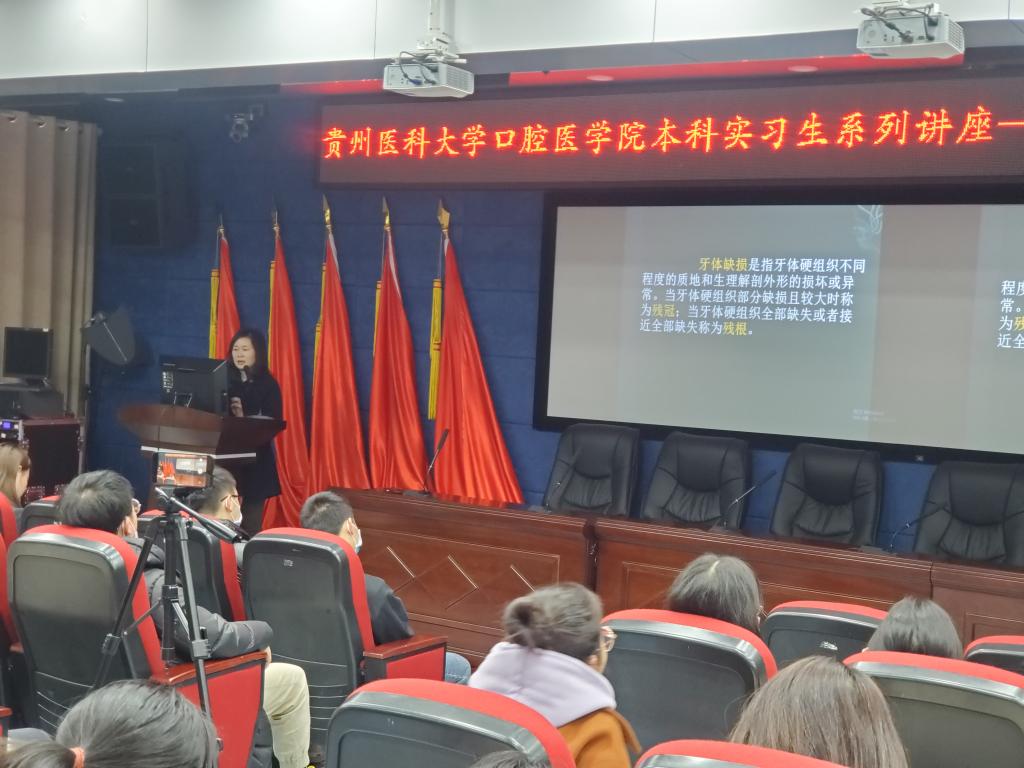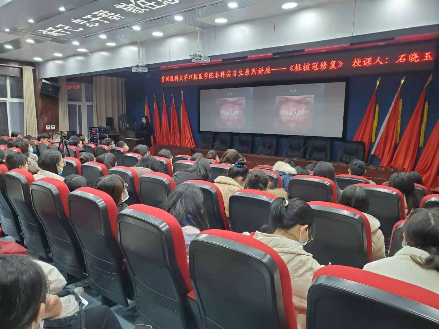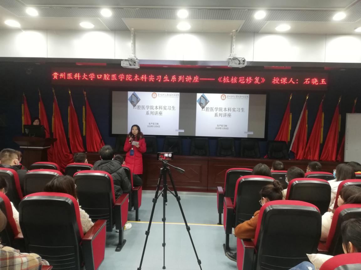 为在临床实践过程中巩固学生专业理论知识,进一步提高实习理论与实践结合的能力,12月8日,口腔学院在行政楼五楼学术报告厅举行了本科实习生系列讲座。此次讲座的主题是“桩核冠修复”,由口腔修复种植科副教授石晓玉主讲,口腔学院2016级实习生、神奇学院2016级实习生参加学习。讲座由生产实习科科长胡睿主持。