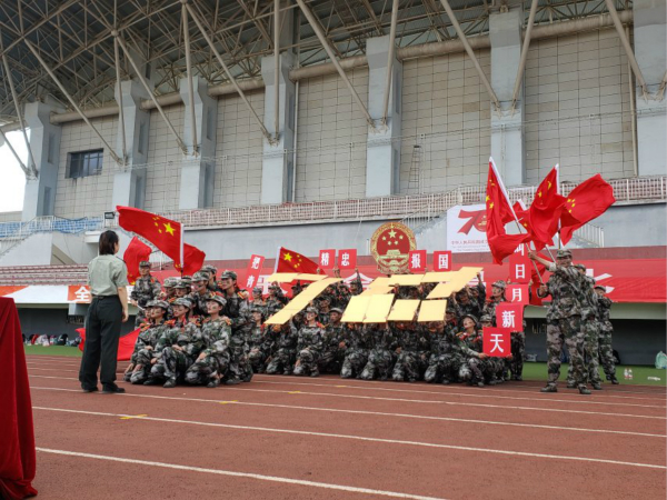 比赛如火如荼地进行着,各个学院为我们带来了一首首激昂的军歌,振奋人心。口院登场时,学生们迈着整齐坚定的步伐,青春的脸庞上洋溢着自信的微笑。音乐响起,大家迅速进入状态,他们在铿锵的鼓点下唱响了《太行山上》,唱出了所有中华儿女的心声,歌声嘹亮,歌声在体育馆久久没有散去。合唱中,同学们用纸板拼出“70”的数字,举着“精忠报国”的标语,表达对祖国最深切的祝福与最诚挚的热爱。最后,他们保持着军人的姿态,迈着整齐的步伐走出赛场,将19级新生在军训中获得的高素养体现得淋漓尽致。