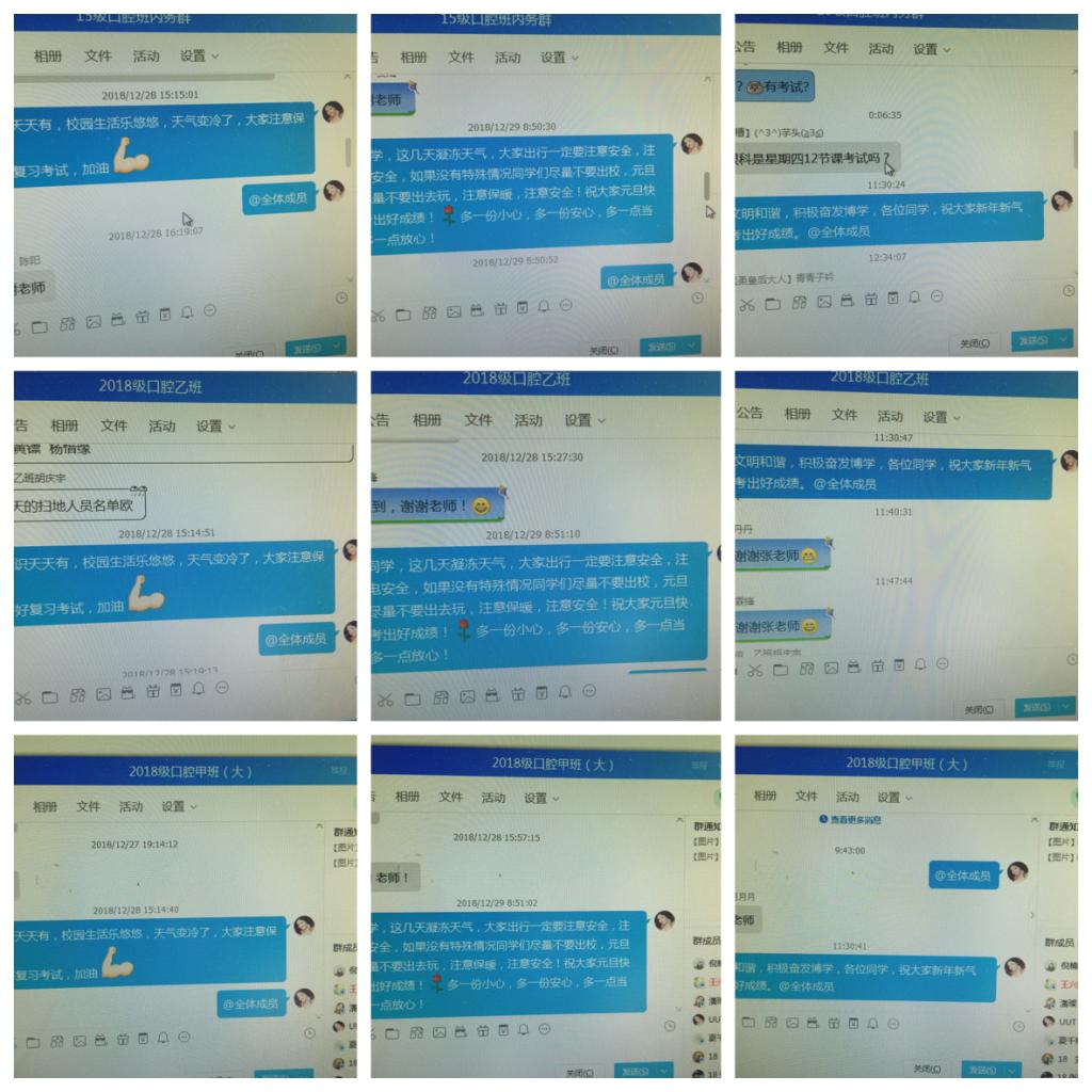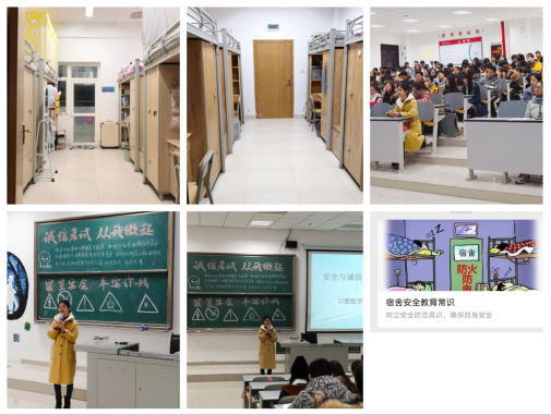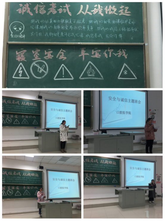 2018年12月26日--28日,口腔医学院在北校区、南校区分别召开以“诚信考试,从我做起,寝室安全,平安你我”为主题的活动,此次活动各班全体同学积极参与其中,同时口腔医学院党委副书记钱禾以及各年级辅导员老师也参与到活动中来。活动形式多样、内容丰富,主要采取以下形式进行:各班组织开展诚信---安全教育主题班会 、开展诚信---安全签名活动、诚信---安全每日一语活动、宿舍安全大排查活动以及安全常识推文活动。