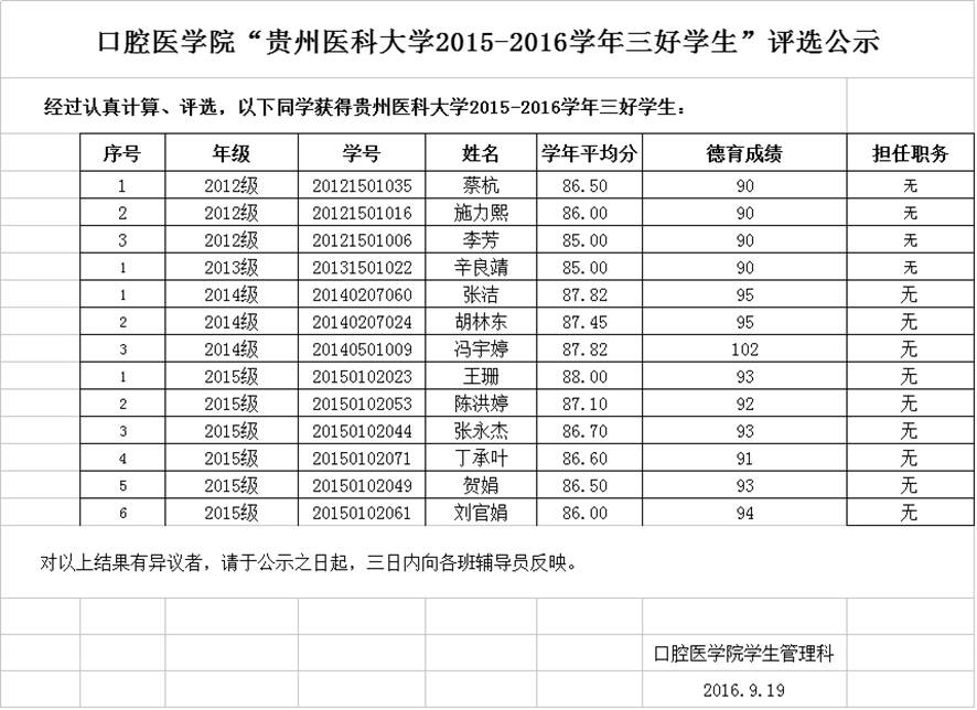 上一条:口腔医学院“贵州医科大学2015-2016学年优秀学生干部”评选公示