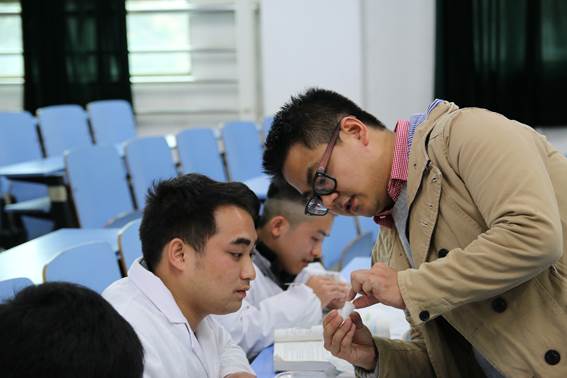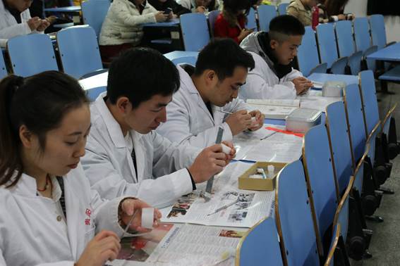 本次雕牙比赛的内容是下颌第一磨牙,限时90分钟,活动本着以赛促学的目的,提高同学们的动手操作能力,加深其对牙体结构的认知程度,参赛同学们热情高涨。比赛中同学们驾轻就熟地在蜡块上进行着勾画、切削、抛光等工作。经过90分钟的精心雕磨,同学们手中的蜡块渐渐变成了一个个玲珑有致的牙齿。