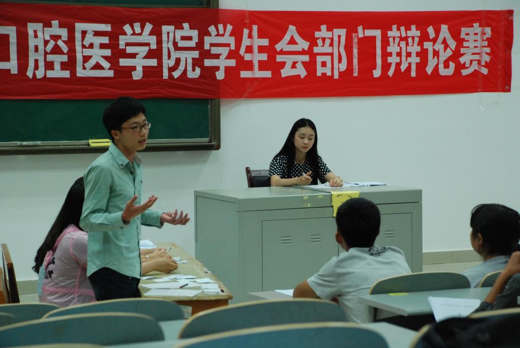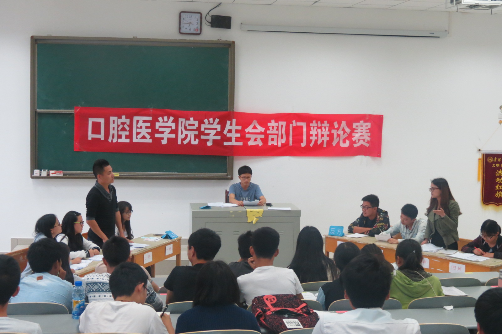 为了提高大学生思辨能力和协作能力,口腔医学院学生会策划了一场趣味辩论赛,比赛分为初赛、复赛和决赛。2015年6月3日晚,在花溪校区4504教室进行决赛,由编辑部和文体部争夺冠军,辩题为“人类将毁于科技吗?”。辅导员张婷老师作为评委之一,也出席了当晚的比赛。
