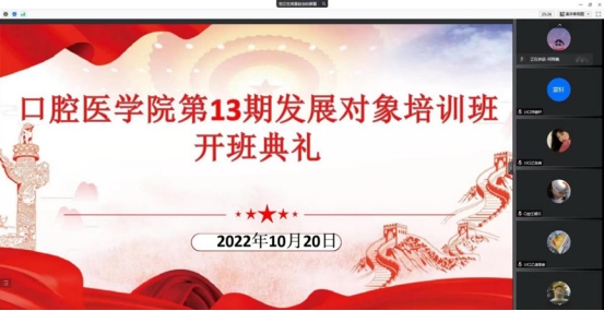 为进一步加强对发展对象的培养、教育和考察,切实提高发展对象的政治素质和理论修养,口腔医学院举办了第13期发展对象培训班。开班仪式在10月20日通过腾讯会议线上举行,党委书记张军梅、党委副书记何雨羲、组织员陈培各及64名学员参加开班典礼,本科生第一党支部书记赵会主持开班仪式。党委书记张军梅、院长马洪分别于开班当天和次日为培训学员授课。
