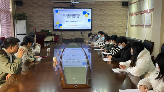 为提升人才培养质量,强化与实习生培养单位的交流,了解实习生的实习意见反馈,12月9日上午,口腔医学院与贵州医科大学医药卫生管理学院教师代表及实习生开展了交流座谈会。医药卫生管理学院药事管理学教研室主任张可人、教师代表朱星月、燕小凡,口腔医学院教师代表姜文文、黄卉及医药卫生管理学院8名实习生参加座谈。口腔医学院生产实习科科长胡睿主持会议。