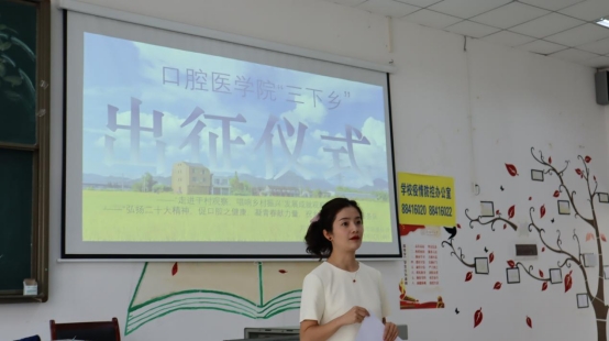张婷在开幕式上致辞,指出此次出征的4支代表队通过层层选拔脱颖而出,代表着学校和学院的形象,希望同学们在志愿服务过程中尊重当地民风民俗,积极奉献,探索新内涵,丰富新内容,以实际行动将活动做实做好,做出示范,做出实效。