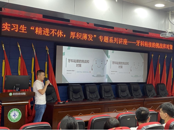 讲座上,罗应坤生动形象地讲解了粘接时间的成功率、全酸蚀与自酸蚀的运用的不同、不同粘接剂三方面内容,让实习生更直观地了解牙科粘接技术的革新和发展,提高了大家探索、学习口腔专业知识的积极性。