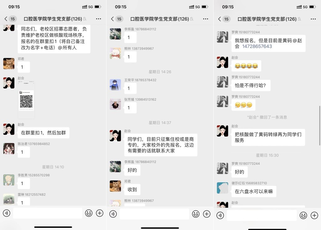 疫情就是命令,防控就是责任。在口腔医学院本科生党支部工作群内,本科生第一党支部书记赵会发出招募志愿者消息的第一时刻,学生党员们一呼百应,时刻保持“战备”状态,用实际行动践行自己的入党誓词。