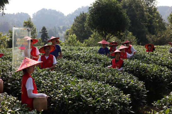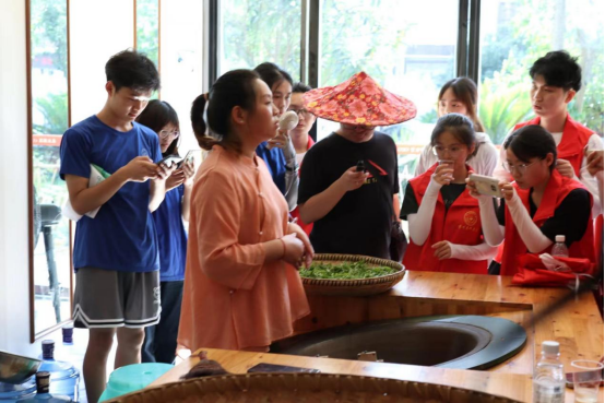 7月17日,湄潭小队还前往茶文化研学基地,亲身体验采茶工作,参观茶海,并前往农户家中进行了走访慰问。在永兴镇开展了采茶工作,在当地专业采茶人员简单培训后,于10号田中亲身体验采茶。当地农户充分结合了现代科学理论与以往种植经验,发展培养出了一定规模的茶田,描绘出了一幅美好的、欣欣向荣的田园风景图。随后相关专业人员对同学们进行了“炒茶”培训并让志愿者亲身实践。