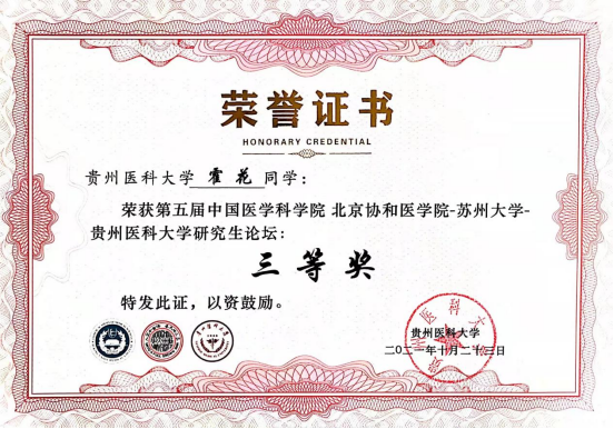 霍花同学作为贵州医科大学研究生代表之一参加论坛汇报评比,最终荣获此次第五届三校研究生论坛比赛三等奖。