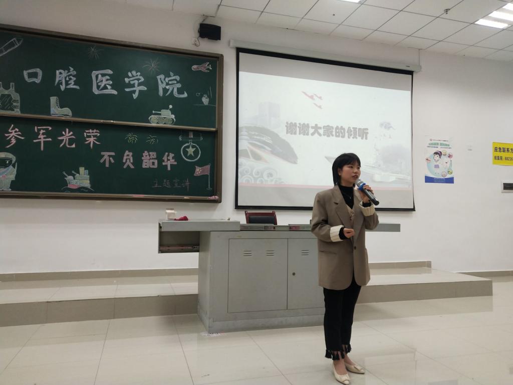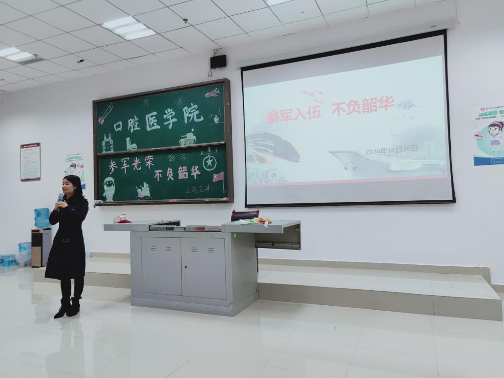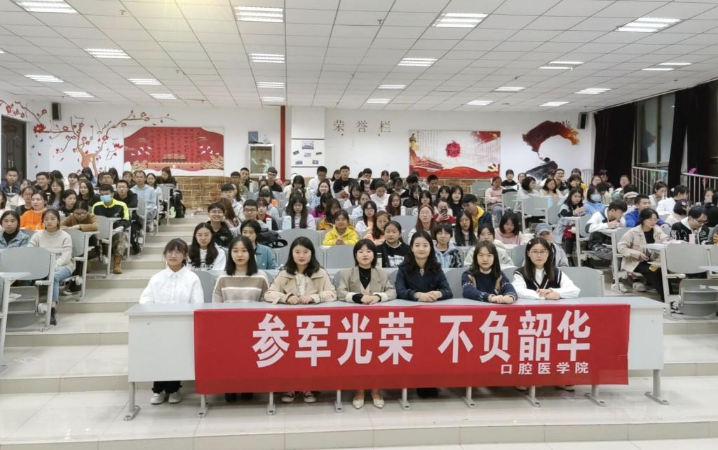 为鼓励学生携笔从戎,提高学生服兵役的责任感与保家卫国的意识,口腔医学院于10月26日在南校区九思楼4406教室举办了“参军光荣,不负韶华”主题宣讲活动。出席本次活动的有口腔医学院学生管理科负责人张婷、2018级辅导员赵会、2020级辅导员汪继蓉、2018级退伍学生王荣平和向金虎以及150余名学生参加了此次活动。
