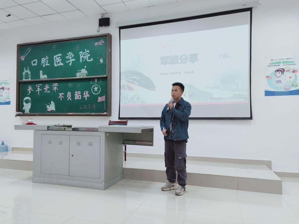 接着大家一起观看了两位退伍学生在贵医校园里拍摄的宣传视频,回到校园的他们依旧保留着在军营养成的良好生活作风,每天生活作息依旧规律,体育锻炼依旧没有懈怠,一套军体拳依旧打得流畅……宣传视频的余韵还未散去,王荣平同学就英姿飒爽地走上讲台,向大家分享了他的军营生活和感受。无论是祁连山下新兵训练的艰苦,还是刘根来连这个英雄连队的传奇故事,还是战友间质朴纯粹的感情,都让同学们听得热泪盈眶。向金虎同学则首先向大家讲述了他的蜕变之旅,从一开始门门落后到后来在母亲的鼓励下以优异成绩通过考核的故事,展示了在军营历练下不懈努力克服先天劣势的顽强品质,还为大家介绍了大学生征兵入伍的条件和流程,并且提到了地方、学校和学院为入伍大学生提供的优惠政策。