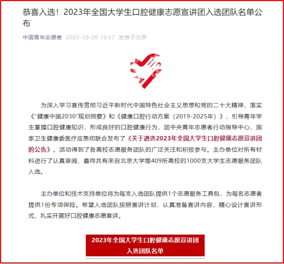 为深入学习宣传贯彻习近平新时代中国特色社会主义思想和党的二十大精神,落实《“健康中国2030”规划纲要》《健康口腔行动方案(2019-2025年)》,引导青年学生掌握口腔健康知识,形成良好的口腔健康行为,团中央青年志愿者行动指导中心、国家卫生健康委医疗应急司联合发布了《关于遴选2023年全国大学生口腔健康志愿宣讲团的公告》。主办单位对所有材料进行了认真审阅,最终共有409所高校的1000支大学生志愿服务团队入选,其中由91直播