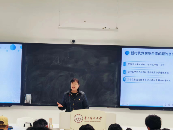 课上,张军梅与同学们一起回顾历史,讲述了台湾问题的由来,并围绕“总体方略的理论来源”“总体方略的丰富内涵”“总体方略的实践要求”三个方面深刻阐释了大陆与台湾在政治、经济、文化等多方面面临的挑战。