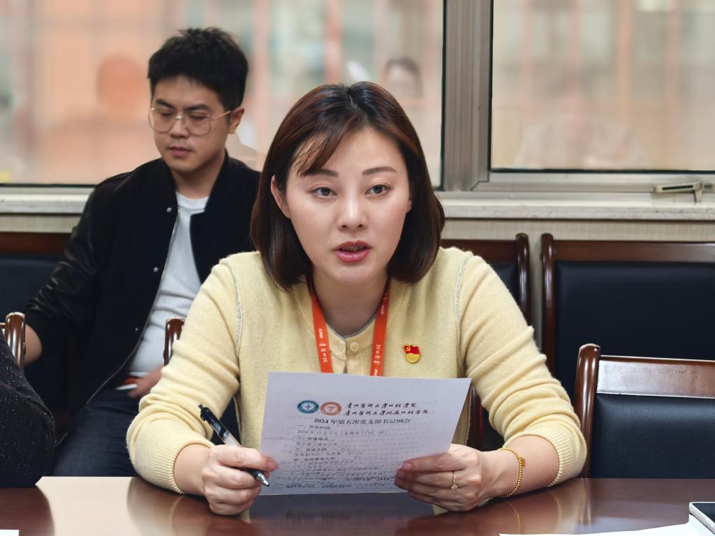 何雨羲传达了贵州省和贵州医科大学党纪学习教育的情况,推进党纪学习教育常态化、长效化并部署工作,要求党支部要推动广大党员、干部持之以恒学纪知纪明纪守纪,拓展学习形式,丰富培训方式,抓好日常警示教育,持续巩固深化党纪学习教育成果。