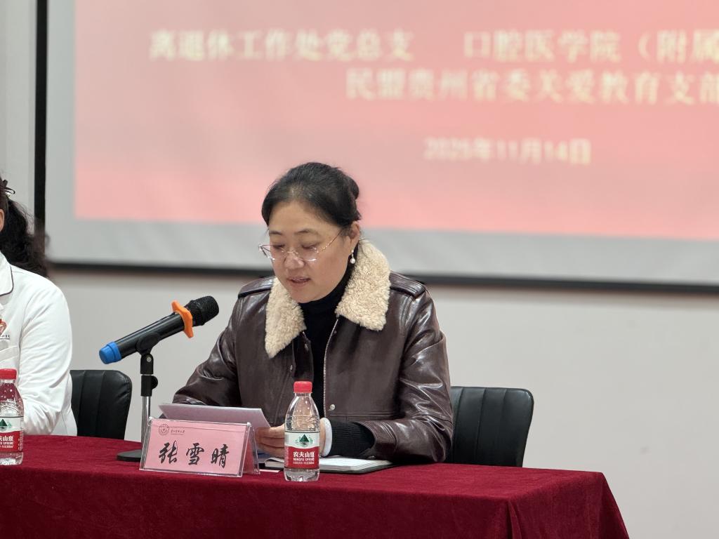 为深入贯彻落实健康中国战略,强化党建引领作用,深化多领域协同合作,切实提升群众口腔健康素养,11月14日,91直播 联合学校离退休工作处党总支、民盟贵州省委关爱教育支部开展“党建引领聚合力,口腔健康护安康”为主题的口腔健康讲座暨义诊服务活动。学校离退休工作处党总支书记、处长张雪晴,91直播 党委书记张军梅、党委副书记何雨羲,民盟贵州省委关爱教育支部主委、省励志公益发展中心秘书长周巧明及贵州省励志公益发展中心秘书长助理、宣传筹资部主任周雪琴出席,91直播 相关职能部门、各科室组成的医疗团队,学校离退休工作处退休老同志、工作人员参加活动。活动由张雪晴主持。