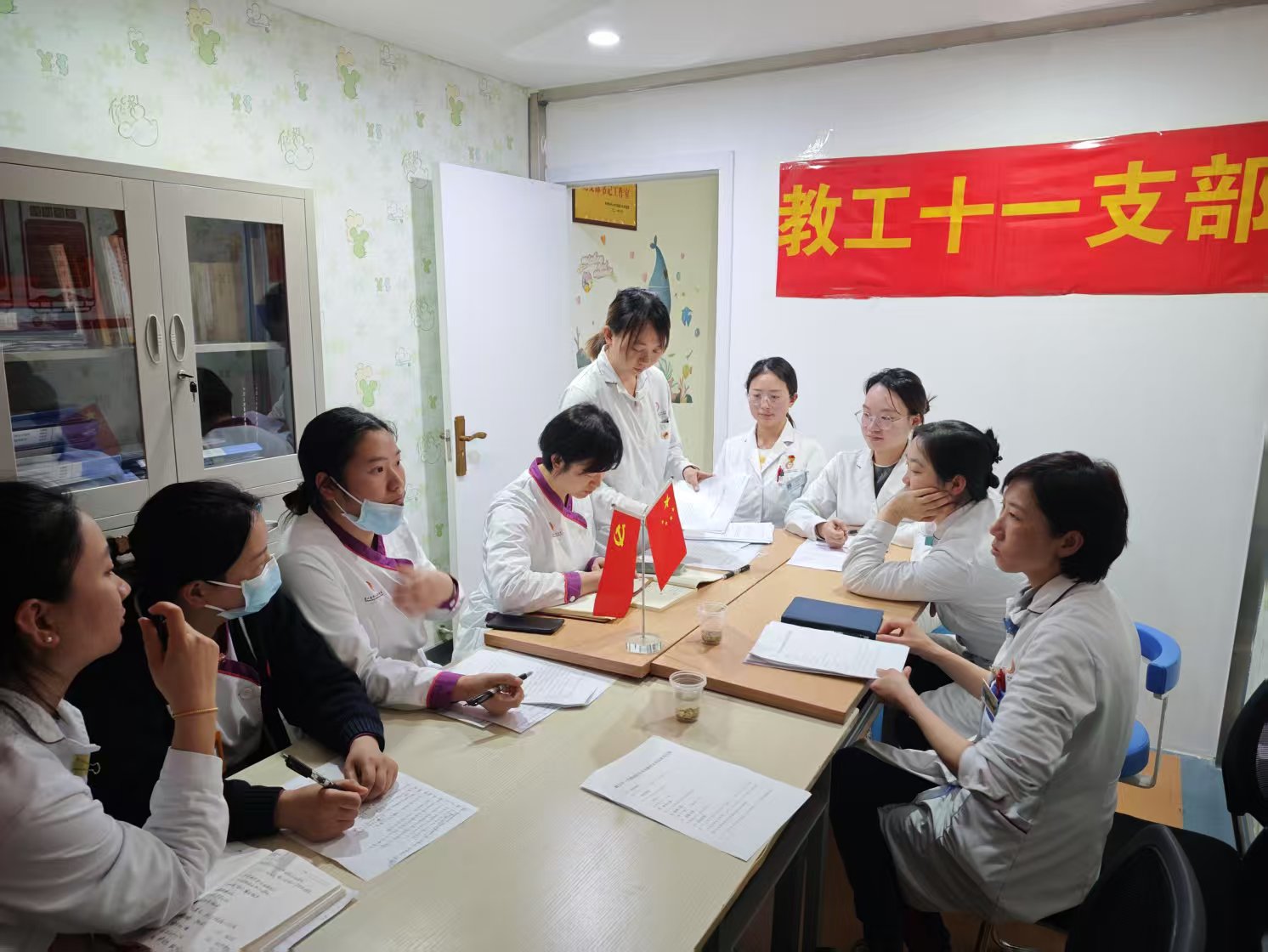 党支部始终把学习贯彻习近平新时代中国特色社会主义思想作为首要政治任务,将领会全会精神与落实健康中国建设要求紧密结合。一是强化支部研学,以党支部和所辖科室为单位,依托“三会一课”、主题党日等载体,组织开展“作风建设与儿童医疗服务”专题研讨,深入学习党风廉政建设工作相关文件和医药反腐、医保基金监管的新形势新要求,引导全体党员深刻把握作风建设的内涵与紧迫感;二是推动全员践学,将理论学习融入日常,利用晨交班、住院医师规范化培训教学、疑难病例讨论等时机,持续深化“以人民健康为中心”的发展思想,转化为“耐心对待每位小患者、用心服务每个家庭”的具体行动自觉,确保党的创新理论入脑入心、指导实践。