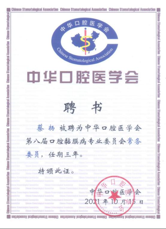 在全国专委会换届会议上,蔡扬再次当选为第八届中华口腔医学会口腔黏膜病专委会常务委员。
