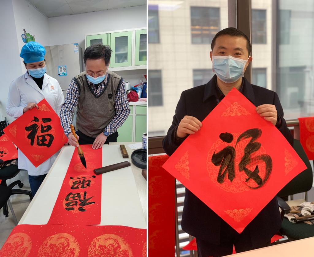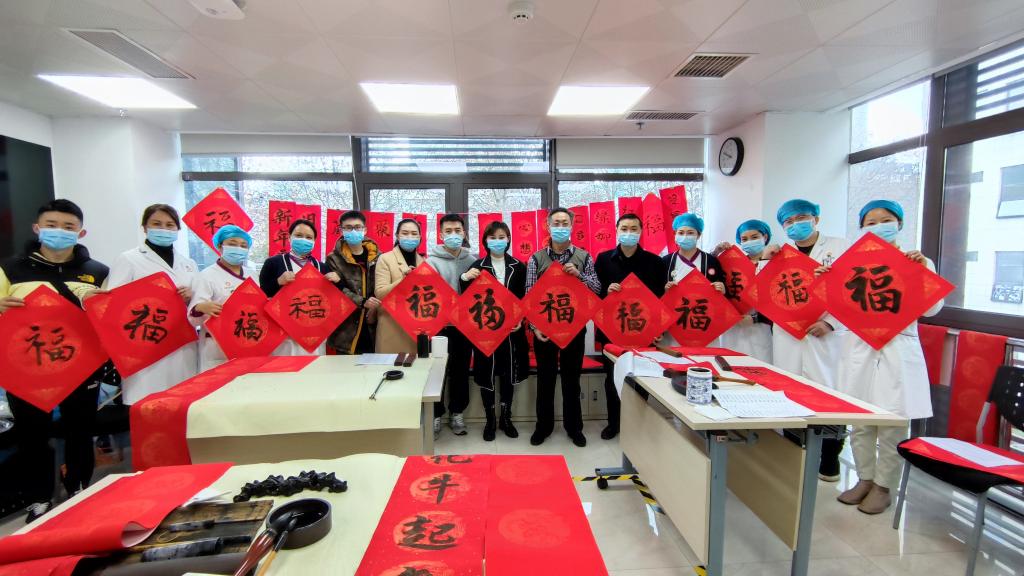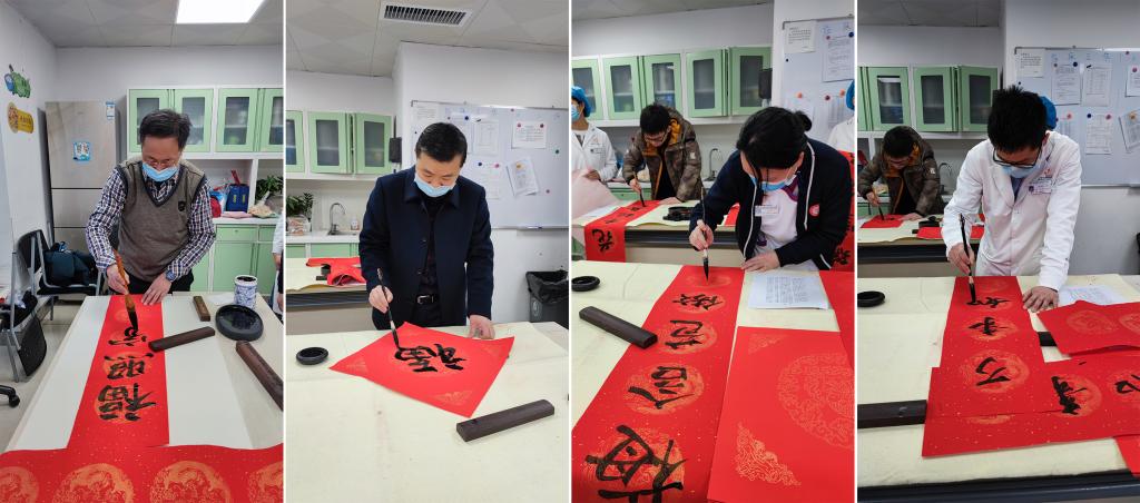 工会组织开展了“送万福,进万家”书法活动,按照疫情防控工作要求,采取分散创作、送“福”到科的方式为医院职工书写春联、送上新年祝福。副院长王永、党委副书记何雨羲出席活动,职工代表廖健、陈仕红、杨易,学生代表林顺恒参加活动,两院团委协助开展相关工作。