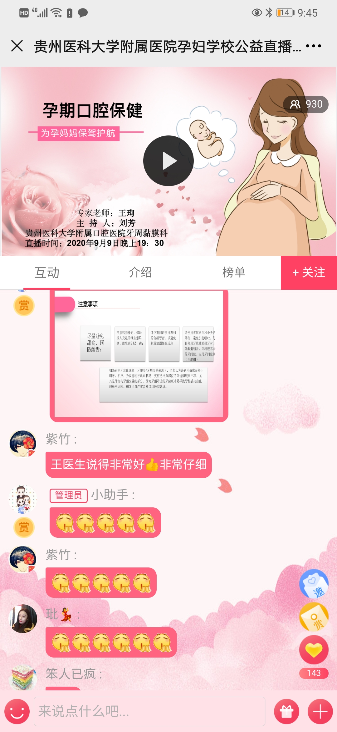 在整个直播课堂中,王珣医师重点讲述了怀孕对口腔健康的影响,孕期口腔疾病有哪些严重危害,孕期常见口腔问题以及孕期看牙时机,并针对怀孕这个特殊时期,详细讲解了孕期及哺乳期口腔保健注意事项,以及孕前应做哪些准备,最终达到不带牙病怀孕的目的。参与直播课堂人数有900多人次,观众热情高涨,直播间互动热烈,纷纷表示老师讲解仔细,学到了很多实用的口腔保健知识,表示会向周围朋友宣传了解到的口腔知识。