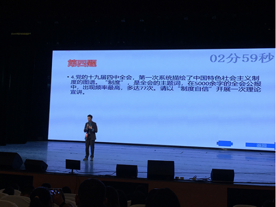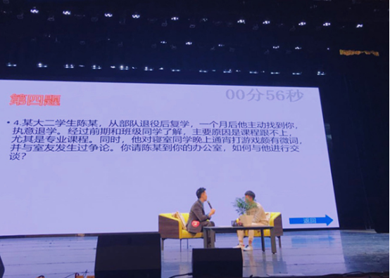 在案例分析环节,刘逸洲老师就随机抽取到的题目“由宗教信仰问题引发的人际交往问题”进行分析,通过对日常学生工作的整理和梳理,结合自身工作经验,给出了解决问题的思路并明确立场,即高校里面禁止做宗教仪式和传教;在谈心谈话环节,就抽取的题目“学业问题”,给出了改变学习方法、增加学习效率、加强与专业教师沟通、提高专业认可度的解决方法,体现了刘逸洲老师对相关理论政策、学生心理特征、学生成长成才规律的了解把握,对问题的解决能力和对学生的教育引导能力;在理论宣讲环节,就抽取的题目“制度自信”进行了5分钟的现场宣讲,结合“何为制度自信”、“我国社会主义制度优越性”以及“应该怎样做好制度自信”三个方面,向在场所有观众阐明了我们每个人都应该是“制度自信”的捍卫者和发声者,体现了刘逸洲老师对习近平新时代中国特色社会主义思想、党的十九大精神的理解能力以及对大学生宣传教育的阐释能力。