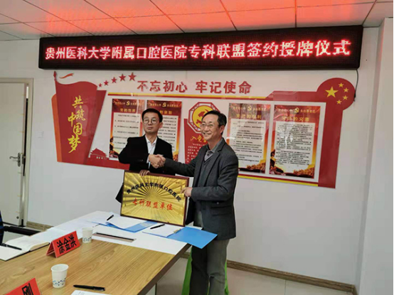 副院长王永、副院长唐正龙、医务科主任王刚、科员李炳洲一行4人前往沿河土家族自治县人民医院进行专科联盟成员单位签约授牌仪式,参加授牌仪式的还有沿河土家族自治县卫健局副局长毛万智,沿河土家族自治县人民医院党委书记张小燕,院长张栩,副院长陈剑波及相关职能部门负责人和沿河土家族自治县人民医院口腔科全体医护人员。签约授牌座谈会由张小燕书记主持。