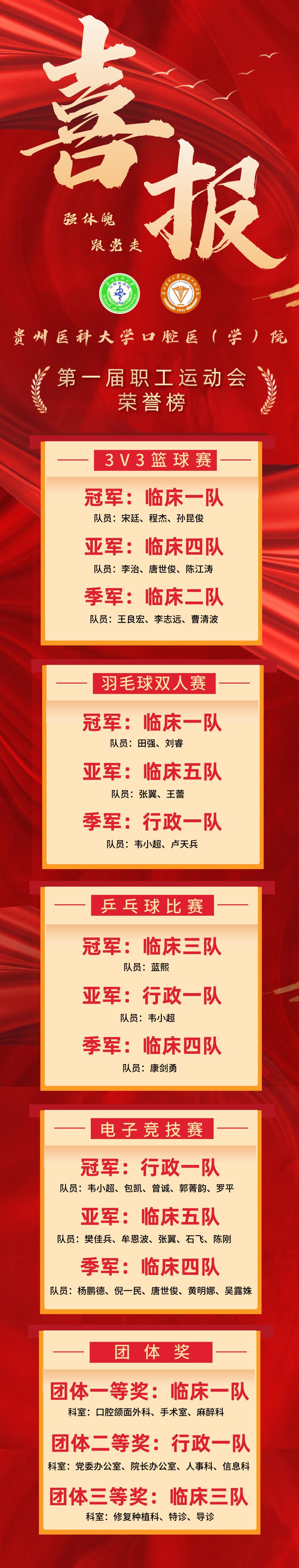 3V3篮球赛,惊心动魄,热火朝天,由临床一队、临床四队、临床二队分别夺得冠亚季军;羽毛球双人赛,对决紧张,热血澎湃,由临床一队、临床五队、行政一队分别夺得冠亚季军;乒乓球单人赛,如火如荼,精彩纷呈,由临床三队、行政一队、临床四队分别夺得冠亚季军;电子竞技赛,气氛热烈,劲头强劲,由行政一队、临床五队、临床四队分别夺得冠亚季军。经总体评定,最终临床一队、行政一队、临床三队分别荣获团体一等奖、二等奖、三等奖。(文后附各队伍获奖人员名单)