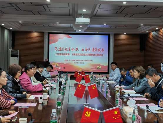 11月29日,口腔医学院党委、法医学院党委结对共建联合主题活动。活动以“党建引领聚合力 业务共建促发展”为主题,在北校区法医学院二楼会议室召开。法医学院院长王杰、副院长夏冰、教工党支部书记任峥和支部全体党员、法医临床教研室(鉴定室)主任汪元河和全体工作人员,以及口腔医学院党委书记张军梅、党委副书记何雨羲、党委办公室主任张娜、院长办公室主任马绮阳、组织员陈培各、工会主席杨蕾、学生管理科科长张婷、团委负责人蒋韵娴和刘逸洲、预防及儿童口腔科副主任魏宏琳、口腔修复种植科在读博士贾源源和教工党支部党员代表参加本次活动。法医学院党委书记黄江主持活动。
