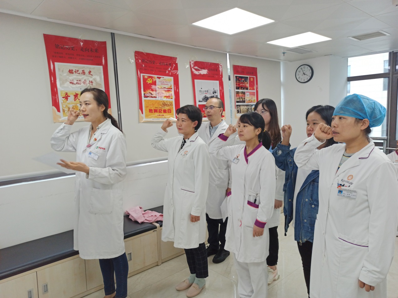 随后,宣传委员朱铭慧作为领誓人,带领全体党员高举右手,面对党旗重温入党誓词;预备党员张翼与会发言,表示这次党课加深了其对中国共产党的认识,坚定了入党的信心和决心;正畸科主任徐卫华、护士长王蕾分别从民主党派和群众的角度做了会议发言。