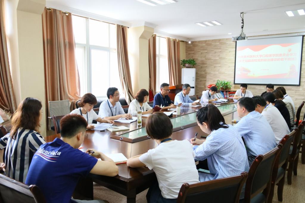 会议传达了省卫健委全省公立医院党建工作推进会会议精神及贵州医科大学《党的政治建设工作方案》文件精神,集中学习了教育部党组出台的《关于加强高校党的政治建设的若干措施》。党委副书记、院长马洪与会讲话,表示要严格落实思想政治工作和行风建设要求,不断强化员工责任心与归属感,为两院和谐发展提供坚强的纪律保障。副院长王永、唐正龙,党委副书记钱禾分别作会议讲话,围绕两院思想政治工作和行风建设情况对行政后勤工作提出具体要求,鼓励大家焕发工作热情,逐渐改进并完善工作中的薄弱环节。
