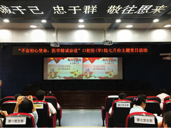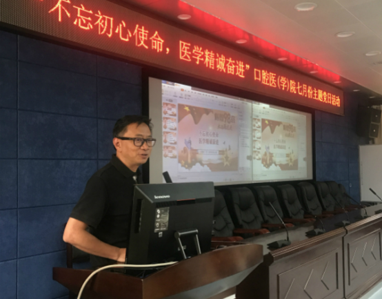 7月25日,口腔医(学)院在行政楼五楼学术报告厅开展了题为“不忘初心使命,医学精诚奋进”的主题党日活动。此次活动由第四教工党支部牵头,贾源源医生主持,全院党支部共同参与。党委书记张军梅、院长马洪、副院长唐正龙走进支部同全院党员共同学习。