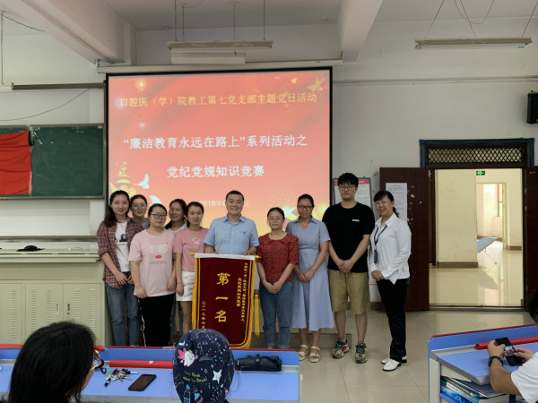 以习近平同志为核心的党中央对加强党风廉政建设和反腐斗争高度重视,采取了一系列强有力的措施,提出“把权力关在制度笼子,老虎苍蝇一起打”,彰显反腐败的强大决心。为进一步增强党员干部维护党规党纪的自觉性、坚定性,响应党中央对党风廉政建设和反腐斗争的高效措施,6月27日,由口腔医(学)院第七教工党支部牵头,全院党支部参与,在北校区基础二号楼2201教室开展了“廉洁教育永远在路上”系列活动之党纪党规知识竞赛。党委书记张军梅、党委副书记钱禾走进支部活动同全院党员共同参与竞赛。