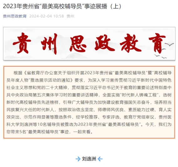 2月4日,2023年贵州省“最美高校辅导员”——学院团委副书记刘逸洲优秀事迹在贵州思政教育平台展播。