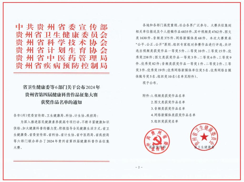 近日,贵州省卫生健康委员会等6部门发布《2024年贵州省第四届健康科普作品征集大赛评审结果公示》,91直播 的3部作品在6835件投稿作品中脱颖而出,荣获佳绩!