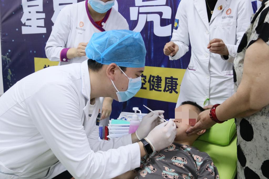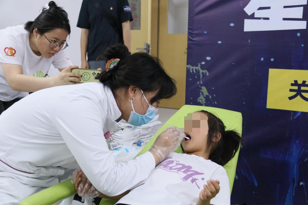 专家们耐心细致地为每一位孩子进行口腔检查,用温柔的话语和专业的技巧缓解孩子们的紧张情绪,并为有需求的孩子进行口腔涂氟。