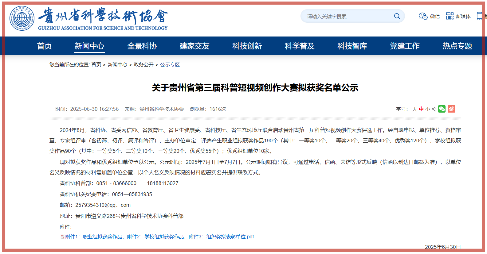 6月30日,贵州省科学技术协会发布《关于贵州省第三届科普短视频创作大赛拟获奖名单公示》,91直播 3部作品在职业组竞赛中脱颖而出,荣获佳绩!