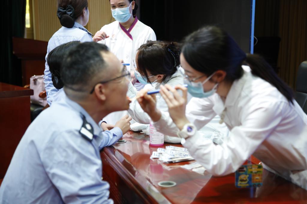 义诊现场,医务人员为民警细致地检查牙齿磨损、龋齿及牙周健康情况,针对存在牙齿健康问题的民警当场制定个性化护理方案,并讲解日常护齿技巧。