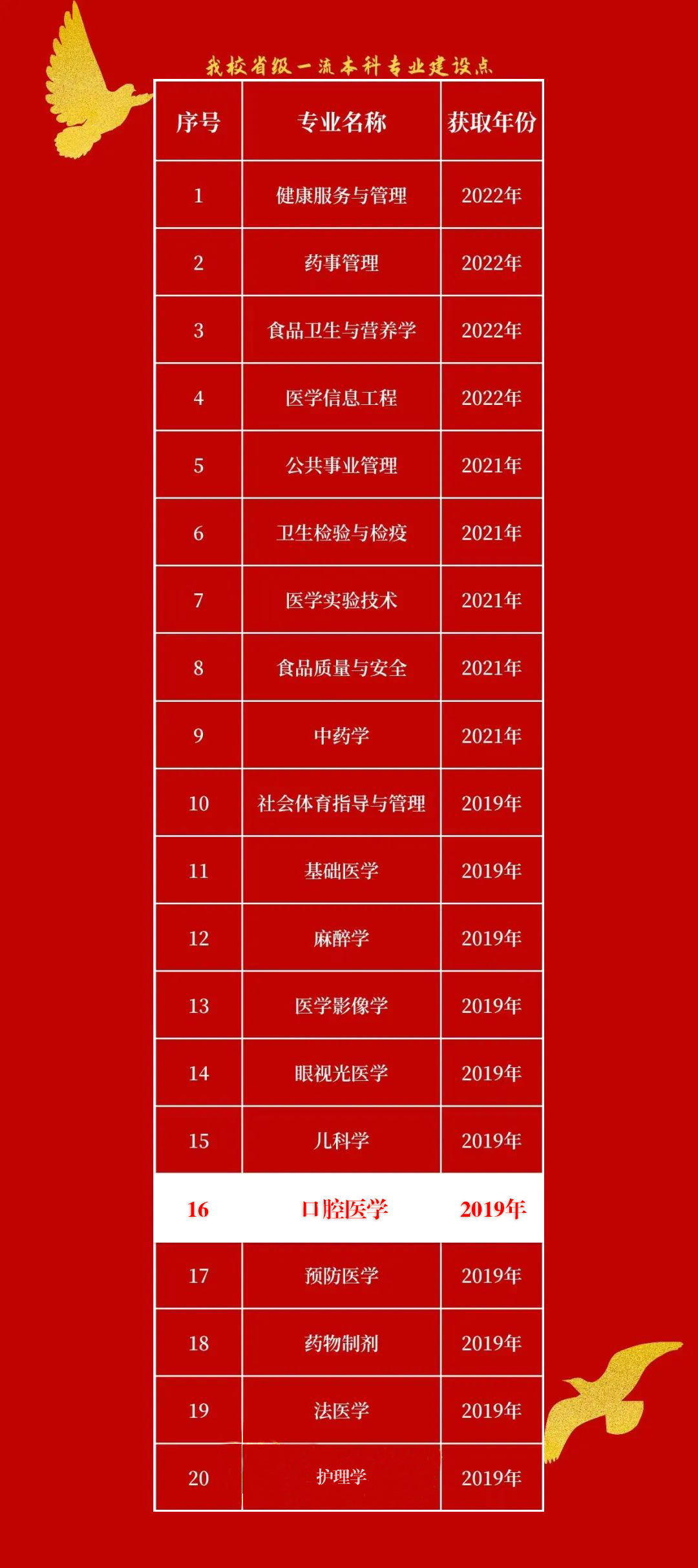口腔医学专业成功获批国家级一流本科专业建设点。目前,学校国家级、省级一流本科专业建设点共30个,为省内国家级一流本科专业建设点最多的医学院校。
