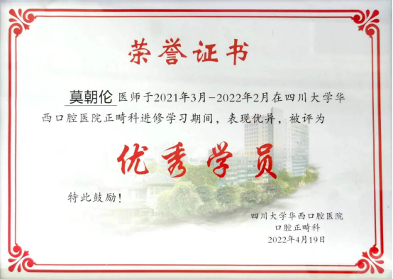 口腔正畸科医师莫朝伦于2021年3月前往四川大学华西口腔医院口腔正畸科进修学习。进修期间主要以临床工作学习为主,同时与华西口腔医学院研究生一起进行《口腔正畸学》理论课程学习,并以优异的成绩通过了分阶段进修学习考核。经过一年的系统学习,在来自全国各地近40名进修学员中,以第一名的优异成绩,荣获华西口院授予的“优秀学员”称号。