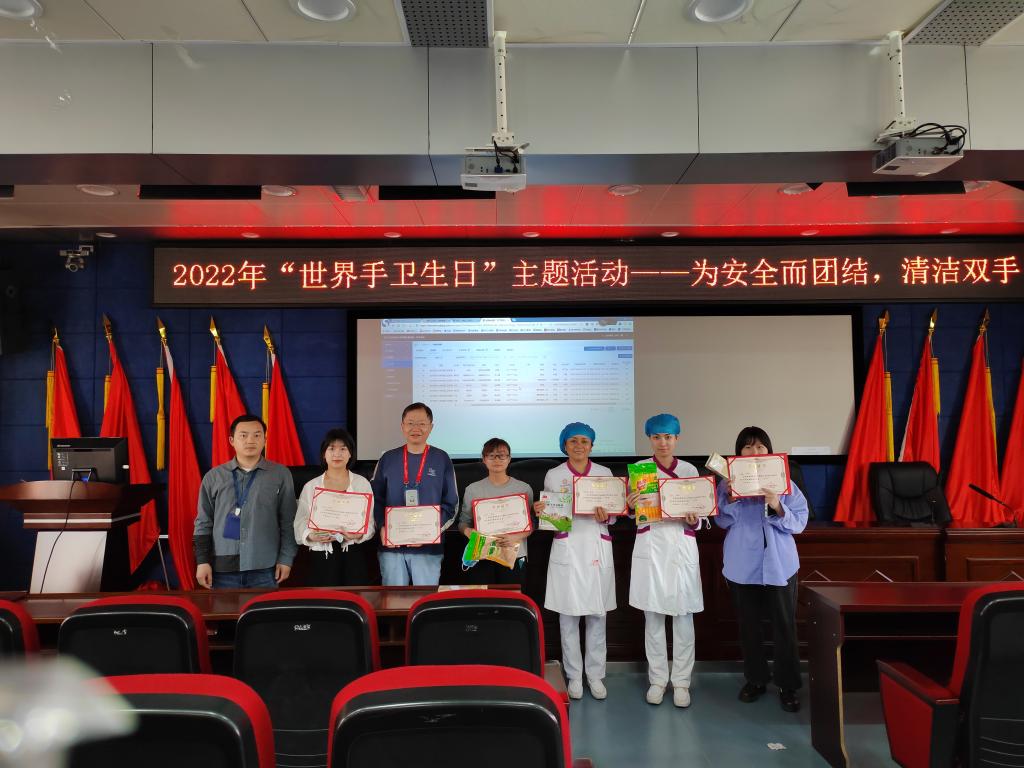 本次活动由三个部分组成:第一部分,在行政楼五楼学术报告厅,现场设立签名墙,党委副书记、院长马洪带领全体职工演练六步洗手法。医院感染管理科负责人陈锐向临床科室、医技科室、后勤人员和保洁人员讲解手卫生知识讲解和六步手卫生要领和注意事项,集体进行手卫生操作。培训后现场考核,评选出一、二、三等奖,颁发获奖证书和奖品。通过实时考核的方法让规范的洗手方法成为全院人员日常习惯。