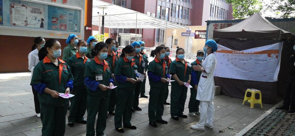 第三部分,由医院感染管理科专职感控老师在门诊前坪向绿地保洁、安保人员发放宣传手册,并进行六步洗手法操作演练。