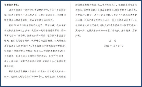 做好老干部工作责任重大。我们要不断创新完善离退休政策、待遇,使大家切实感受到口院的温暖和关怀。希望退休职工们“退而不休”“常回家看看”,为继续口院的发展和兴盛献计出力。